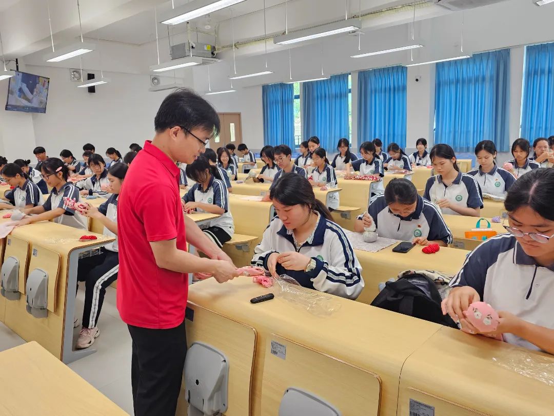 随后来到“非遗艾锤”制作环节。在讲解老师的悉心指导下,师生们将艾绒、决明子等多种药材按照特定比例混合好后用纱布将药团精心包裹,插入预先准备好的锤柄,再用染饰布进行装饰包裹,并以棉线进行细致的缠绕与捆扎,确保其结构稳固和美观……整个体验过程,师生们全神贯注,一丝不苟,不时交流着制作心得,分享彼此的创意与技巧。不一会儿,一个个色彩斑斓且兼具养生功效的艾锤便呈现在眼前了。