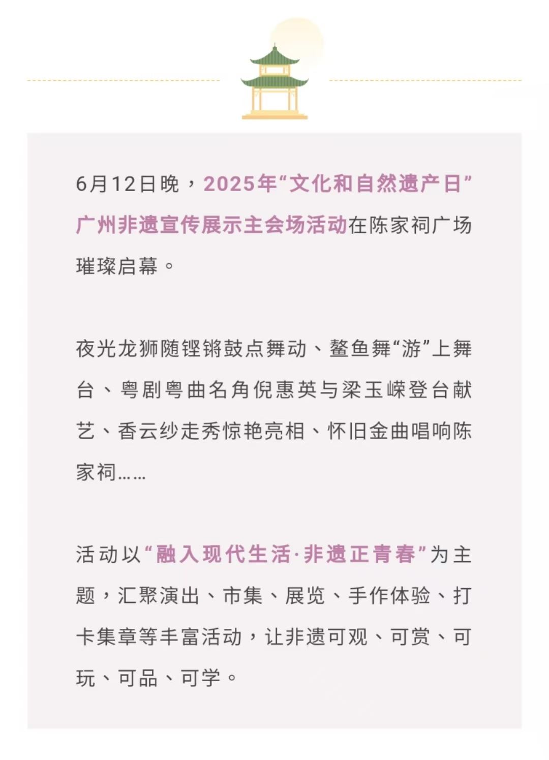 本场晚会也拉开了广州非遗宣传展示系列活动的序幕。据悉,6月至7月全市各区将举办200多场形式多样的非遗宣传、展示、展演、展销、体验活动,推动非遗融入当代生活。