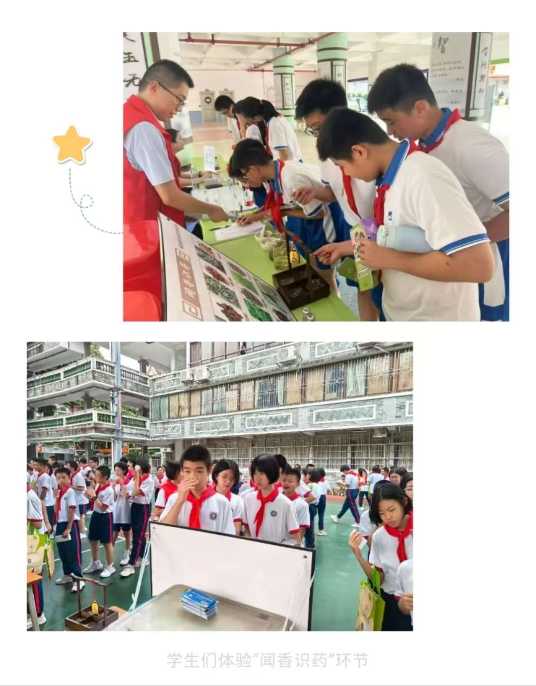 在闻香识药区,紫苏、砂仁、草果、肉桂等具有浓郁特征香气的岭南药材被精心封装于特制闻香瓶中。学生们以“嗅觉”为媒介,纷纷辨识与匹配中药名称,从中体会中药“四气五味”的奥妙。