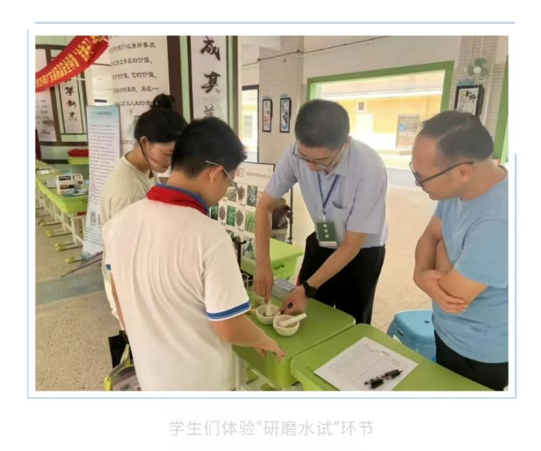 在水试研磨区,学生们在工作人员的演示下体验亲手研磨乳香等,认真观察其在水中的变化。随着乳白色液体的呈现,并散发出淡淡的的香气……这一过程不仅让学生们直观地感受到了乳香的特性,还学习了如何通过物理方法辨识药材真伪。