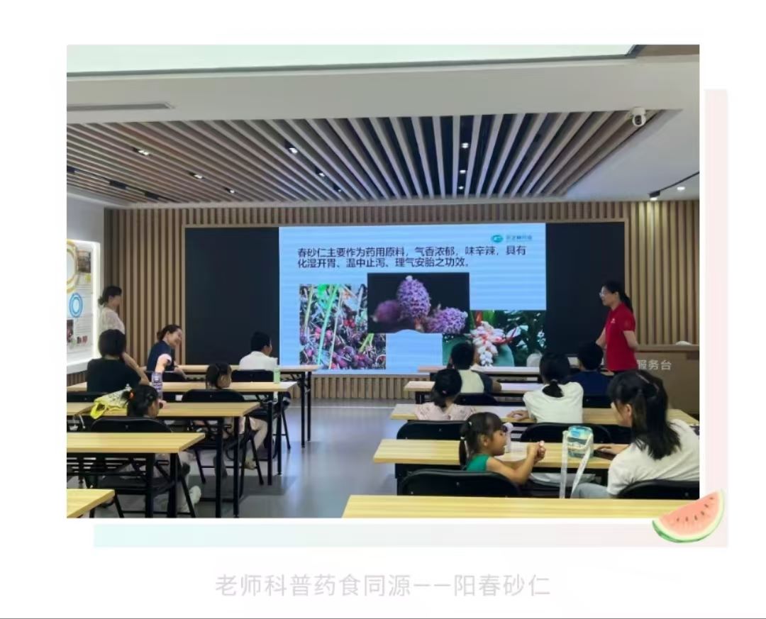 课上,老师重点介绍了药食同源的阳春砂仁,详细讲解其"化湿开胃、温中止泻"的药用价值,以及春砂仁茶、春砂仁蜜等养生制品的制作方法。
