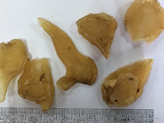 (3)白附片:选择较小一点的泥附子,除去泥土,洗净,浸在稀胆巴水中,4~5天后与盐卤同时入锅煮至透心为度。捞出,剥去外皮,切成0.3~0.4厘米厚片,用清水漂2~3天,至口尝无麻舌感为度。取出,再蒸熟,晾至半干时,用硫磺熏白,晒干。
