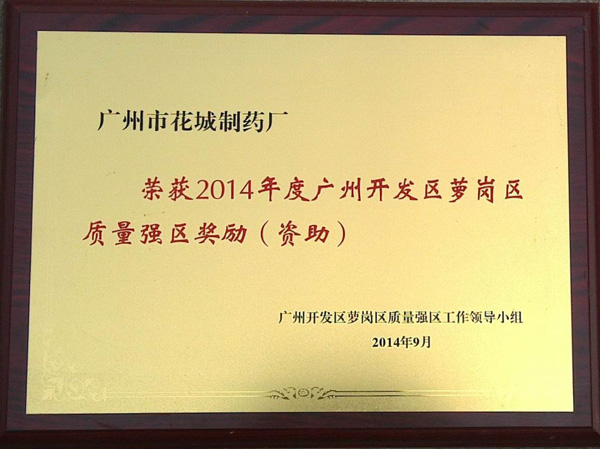花城制药厂讯 (通讯员张志坚)根据《广州开发区萝岗区质量强区工作奖励(资助)实施细则》,2014年度广州市花城制药厂申报了“花城”牌市箸名商标项目、GMP认证项目(共3个)、补血宁神片标准项目、腹可片(薄膜衣)标准项目,上述6个项目共获得萝岗区人民币50万元奖励(资助)。萝岗区政府于2014年9月5日在萝岗区会议中心举行了颁奖仪式。