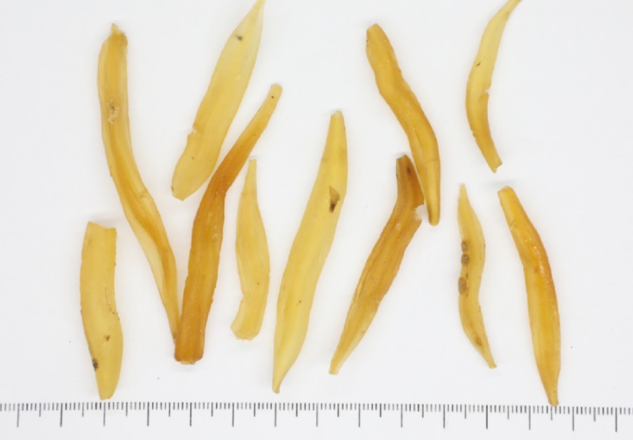 药材性状:呈长纺锤形,略弯曲,长5~18cm,直径0.5~2cm。表面黄白色至淡黄棕色,半透明,光滑或具深浅不等的纵皱纹,偶有残存的灰棕色外皮。质硬或柔润,有黏性,断面角质样,中柱黄白色。气微,味甜、微苦。