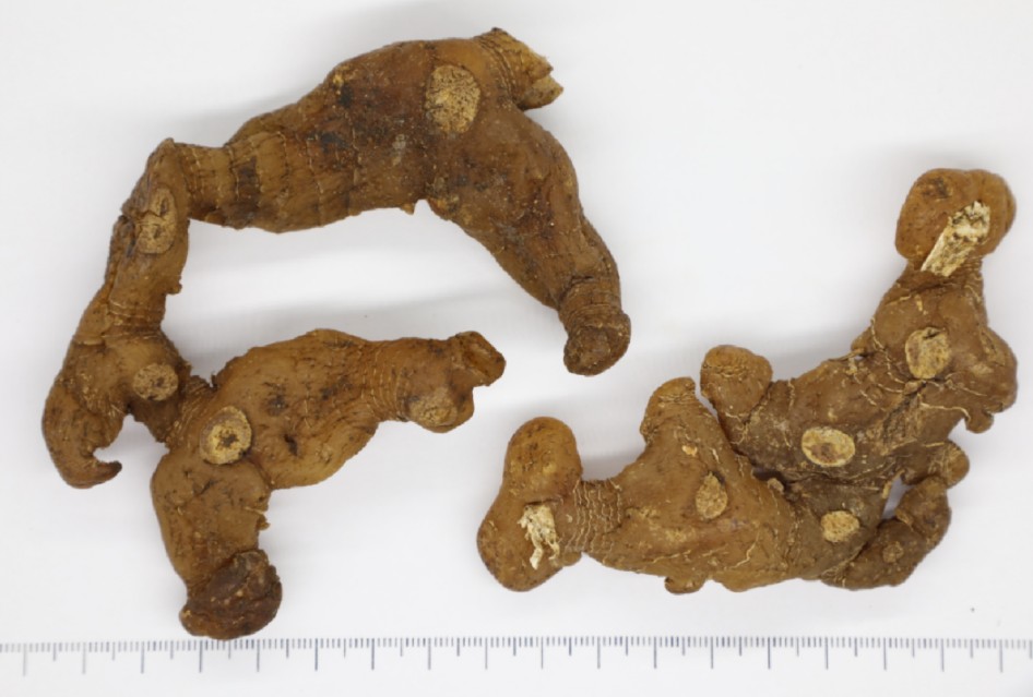 药材性状:呈肥厚肉质的结节块状,结节长可达10cm以上,宽3~6cm,厚2~3cm。表面淡黄色至黄棕色,具环节,有皱纹及须根痕,结节上侧茎痕呈圆盘状,圆周凹入,中部突出。质硬而韧,不易折断,断面角质,淡黄色至黄棕色。气微,味甜,嚼之有黏性。